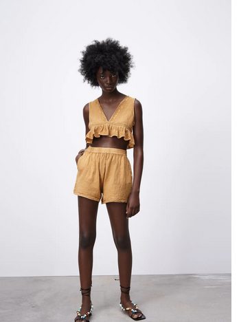 Terminamos este repaso a las mejores camisas y tops de Zara con este modelo, en este caso con un top con volantes. En el modelo cropped, y como puedes ver en la modelo de la imagen con escote pico y manga sisa. Y sí, el detalle es ese bajo acabado con volante.