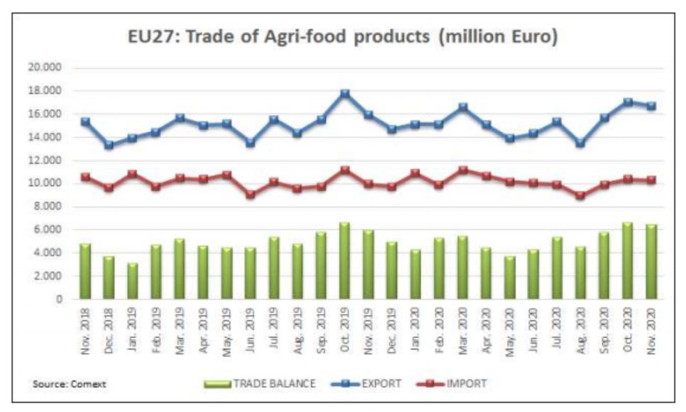 Concretamente, según los datos de enero a noviembre de 2020, el exceso de oferta en la UE se situó en 56.202 millones de euros, con una mejora con respecto al mismo período de 2019 de 1.054 millones. Si bien el global es positivo (en productos como el trigo, la leche o la mantequilla), el análisis de sus componentes revela la dependencia europea de importaciones de terceros países en oleaginosas, cereales, frutas tropicales, frutos secos, café y cacao, estando la mayor parte de ellas calificadas por riesgo de deforestación en sus países de origen o con una considerable huella de carbono, la cual se pretende penalizar con el establecimiento de un arancel de carbono en frontera. En total, el déficit comercial en “commodities” asciende a 14.955 millones de euros, reduciéndose en 2.071 millones de enero a noviembre de 2020 con respecto a 2019.