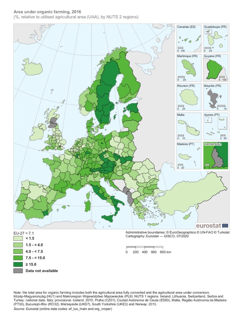 Este resultado empírico debería ser tomado en consideración para redirigir las estrategias políticas antes señaladas de la Comisión Europea hacia las producciones “tradicionales”, es decir, aquellas que ya son prácticamente “ecológicas” dado que no se usan fertilizantes, pesticidas u otros productos químicos. Es el caso de la región de Salzburgo (Austria), donde la agricultura ecológica supone más del 50% de la superficie agrícola en uso, por delante de otras zonas como Severozápad (República Checa), Norra Mellansverige (Suecia) o Calabria (Italia), todas ellas en torno al 30%. El nexo común de estas zonas es que siempre predominó mayoritariamente el sistema de cultivo tradicional.