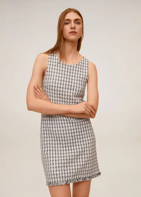 Este vestido tiene un diseño corto y un tejido de punto. Su cuello tiene una forma redonda y no tiene mangas. Lo más característico es su bajo, que está deshilachado. El vestido tiene un cierre de botón en la parte superior, así como un forro en el interior. Este vestido tiene una rebaja del 23%, y cuesta 22,99 euros.