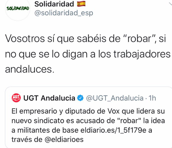 Una de sus respuestas a UGT Andalucía es una de las más recordadas. El sindicato tradicional, liderado en esa Comunidad por Carmen Castilla, se hacía eco del supuesto ‘robo’ de la idea para crear Solidaridad, que reaccionó con las sentencias judiciales sobre el caso delos ERE de Andalucía. El sindicato, ya sin palabras para responder, prefirió bloquear a los afines de Vox.