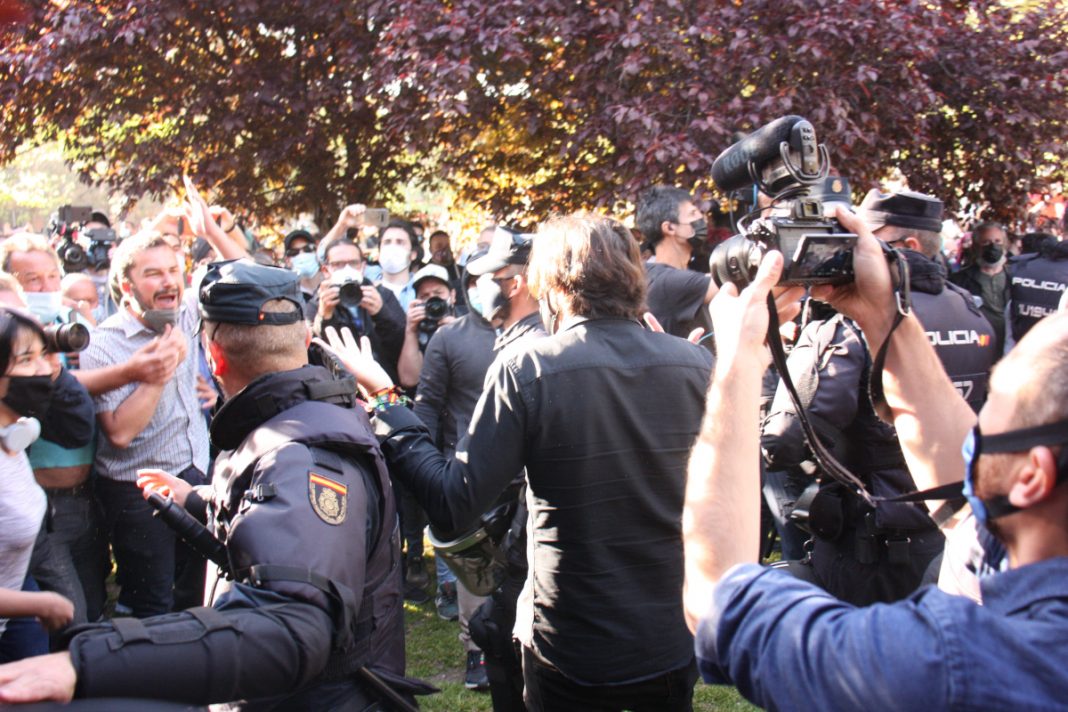 La entrada de Cake Minuesa, uno de los periodistas más críticos contra la izquierda, en los alrededores del parque de la Plaza de la Constitución ha encendido los ánimos de los más extremistas. De hecho, el informador, que ha pedido en todo momento la libertad de expresión, ha tenido que ser escoltado por la policía para poder realizar su labor.