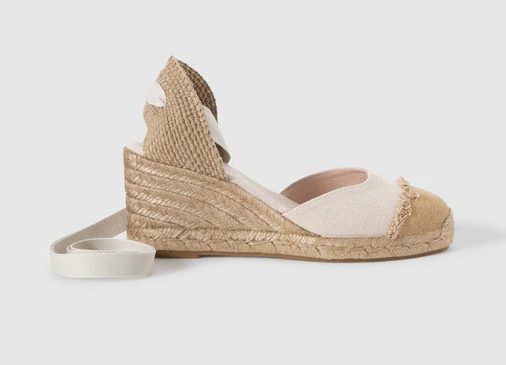 Estas alpargatas de cuña en algodón tiene una puntera de flecos, forro de piel porcina y tacones de mezcla de fibras y yute. La planta EVA está forrada también de algodón y lleva un cierre mediante cintas al tobillo de 5 cm de altura. Su precio es de 59,99 euros.