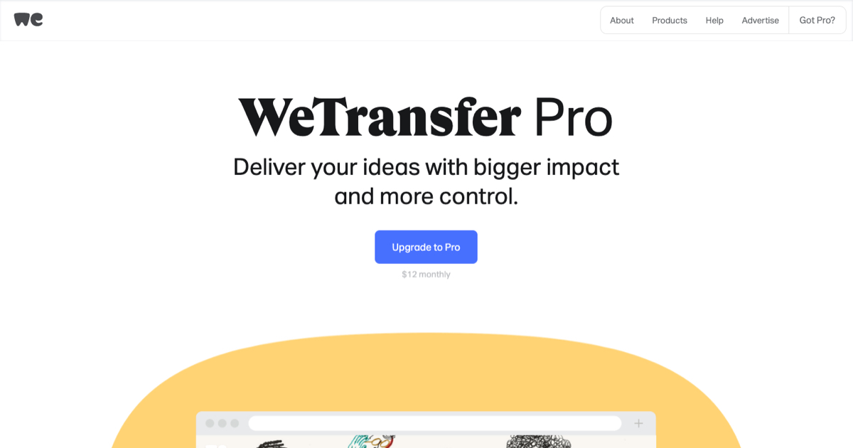 Con Pro, podrás enviar transferencias a hasta 50 personas a la vez, en comparación con los 3 destinatarios disponibles cuando utilizas la versión gratuita de este servicio. Con una cuenta WeTransfer Pro, podrás almacenar hasta 1TB en transferencias enviadas (o recibidas) desde tu perfil Pro. Después podrás acceder a ellas cuando quieras. Si tienes WeTransfer Pro, también podrás recibir archivos de otras personas con un tamaño de hasta 20GB.
