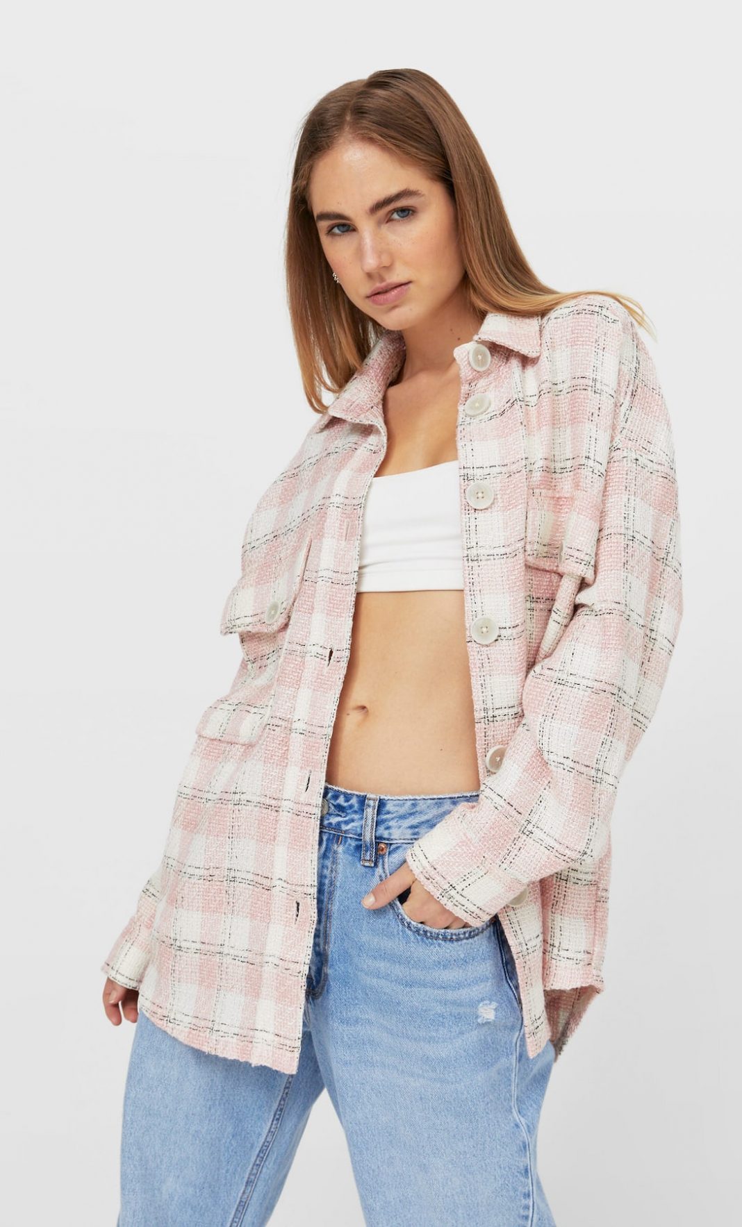 Por separado, todos los estilos, la blazer, las sobrecamisas y otras prendas que Stradivarius tiene en rebajas. Comenzamos con esta sobrecamisa de cuadros cuello solapa y manga larga. Puedes ver que tiene cierre frontal con botones y unos bolsillos laterales ocultos en costura. Su precio es de 19.99 euros y viene con una oferta del 44%.