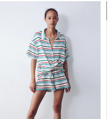 Terminamos nuestra visita a las estanterías del Zara con una prenda que es muy usada durante la época estival. En este caso una bermuda Jacquard a rayas. Como puedes ver, se trata de una bermuda de tiro alto y cintura elástica. Y su precio es 15,95 euros, aunque solo viene en el color que muestra la modelo de la imagen.