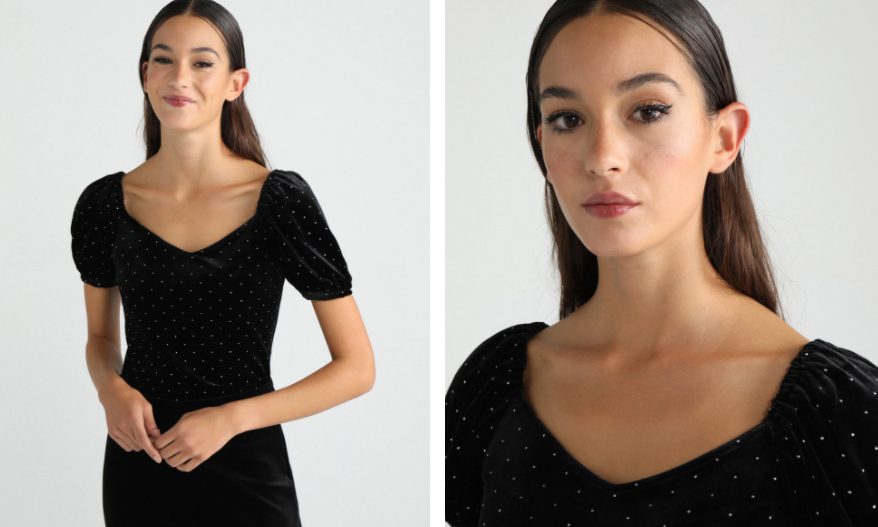 Seguimos con el terciopelo como el pantalón anterior, aprovechando que combina perfecto y además son del mismo material. Te presentamos este top de terciopelo con manga farol de Green Coast, una marca elegante pero a la vez juvenil. Su precio te volverá a soprender porque está casi regalado: 7,99 euros tras el 73% de descuento.