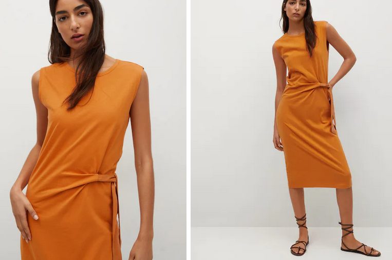 Por solo 15.99 euros puedes encontrar este vestido de algodón nudo de Mango. Viene en algodón sostenible y tiene un diseño midi. Viene con cuello redondo y sin mangas. Además con un dudo decorativo y una abertura posterior en el bajo. Y que viene en tres colores: naranja, kakhi y negro.