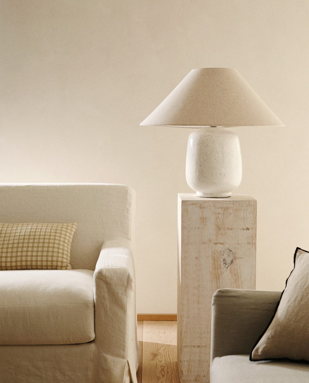 En nuestros hogares nunca pueden faltar los elementos de iluminación para dar luz a nuestras estancias. En el salón no puede faltar una lámpara. En este caso nuestra recomendación de Zara Home es esta con base de cerámica con efecto craquelado y pantalla cónica de lino.