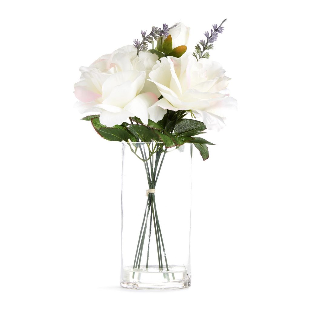 Por eso, en un principio, podemos elegir llevarnos este jarrón de vidrio decorado con algunas flores artificiales en tonos blancos y rosas, muy fáciles de combinar con el resto de elementos de la casa.