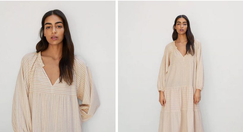 Las mid-season sales ya están aquí. Las rebajas de la mitad de la temporada han desembarcado en Mango y están dispuestas a arrasar, y lo puedes hacer con este vestido en algodón con rayas. Su precio es más elevado que el de aberturas, ya que cuesta 49,99 euros.