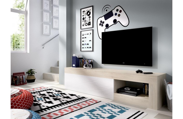 Es un mueble perfecto de madera en color blanca, fabricado con madera natural para colocar tu televisor en el salón. Además, contiene una estructura del módulo que tiene incorporado un espacio abierto y una puerta abatible que nos servirán como una zona de decoración y almacenaje. Los montajes de las puertas son reversibles para elegir los sentidos de aperturas que se adapten mejor a nuestras necesidades. Podemos adquirirlo por Leroy Merlín por un precio de 69,99 euros.