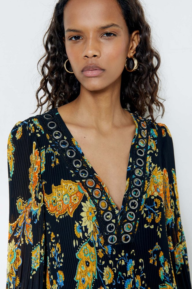 7Vestido plisado y estampado de Sfera, demasiado recargado
