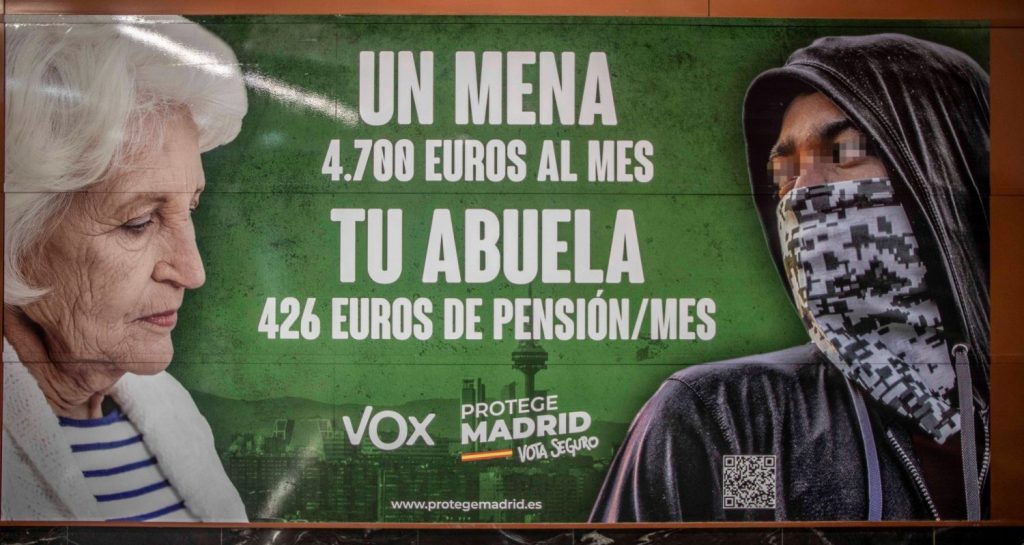 El cartel electoral, instalado en la céntrica estación de Sol, muestra a un MENA encapuchado con un pañuelo tapando el rostro y dejando al descubierto únicamente la frente y los ojos. Junto a él y con una mejor iluminación se muestra a una anciana, pensionista, bien arreglada.
