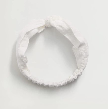 Los complementos para el pelo están muy de moda desde hace varias temporadas y podemos encontrar elementos como coleteros de tela en diferentes colores, bandanas, pinzas de todo tipo, pañuelos, turbantes, y hasta coronas de flores. En Mango podemos hacernos con una bonita diadema de algodón perfecta para combinar con vestidos y prendas primaverales. Es de 100% algodón, con bonitos detalles de bordados y un nudo en la parte superior a modo de pañuelo. Ideal para completar nuestro look y a la vez mantener la melena recogida y apartada de la cara. Tiene una parte elástica para un mejor ajuste y se encuentra disponible en dos colores, azul oscuro y blanco. Tiene un precio de 9,99€.