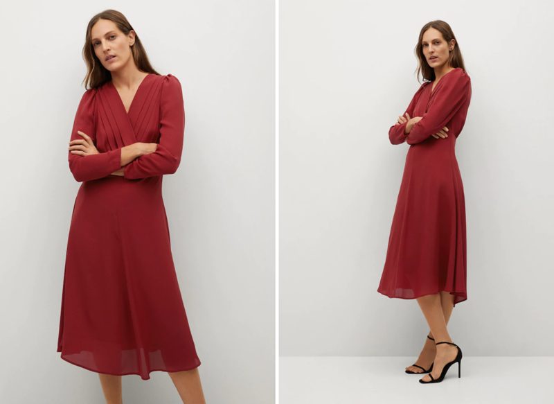 En Mango puedes encontrar descuentos en algunos monos y vestidos. Un claro ejemplo de ello es este vestido con detalles plisados. Está disponible en color rojo y en rosa, en ambos casos a un precio de 39,99 euros.