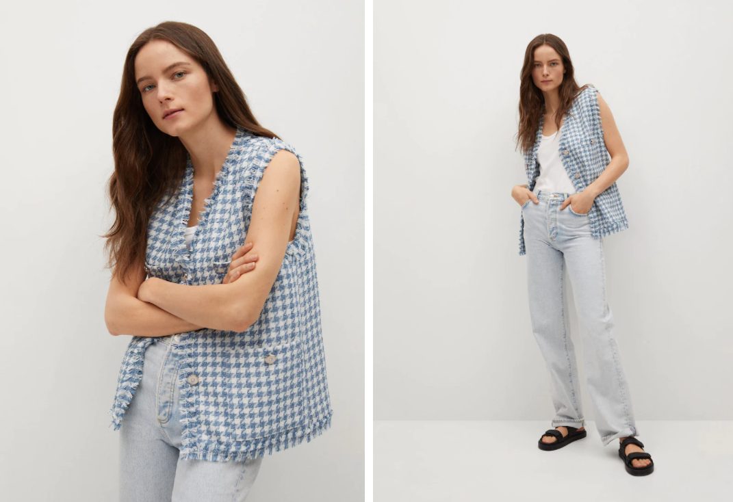 Otro de los chalecos más bonitos, sencillos y fáciles de combinar que podemos encontrar en Mango es este de tejido y estampado tweed. Con una forma que resaltará nuestro cuerpo, captará todas las miradas.
