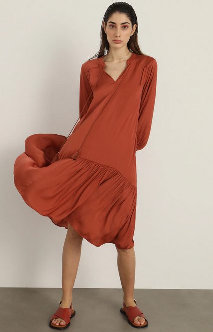 Otro de los vestidos que no pueden faltar en tu guardarropa es uno como este de El Corte Inglés, fluido y totalmente suelto, para esos días en los que la comodidad es lo primero que buscas. Es de manga larga con goma en el puño, y un cuello en pico con detalle de cintas, y un amplio volante en el bajo. Es una prenda casual para momentos informales y relajados, con un corte asimétrico un tejido en 100% poliéster increíblemente fluido y ligero y con mucho movimiento. Está disponible en color teja y en color musgo. Tiene un precio rebajado de 34,99€ y los puedes comprar online en este enlace.