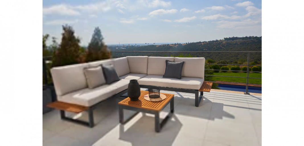 Vamos a comenzar fuerte, con una renovación total. En este caso se trata de un set de muebles para jardín o terraza modelo Oris, de Naterial, compuesto por 1 mesa baja de centro y 1 sofá esquinero (formado por 2 sofás de 2 plazas y 1 sillón esquinero) con capacidad para reunir a 5 personas en el exterior de tu vivienda. Ideal para la celebración familiar de una barbacoa.