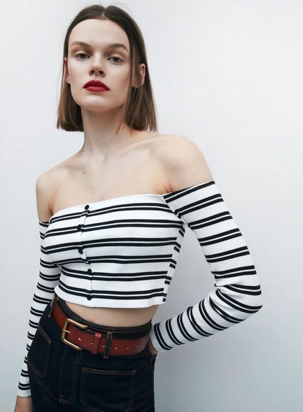 A veces, para hacer que un look sea especial, no hace falta nada más que una parte de arriba que tenga algo especial. Y una gran apuesta es esta camiseta crop de manga larga y estampado de rayas con los hombros al descubierto, y botones en la parte delantera. Perfecta para combinar con unos vaqueros, unos shorts o una minifalda, y dar un paseo por tu ciudad una tarde de primavera. Es de algodón muy suave, pero a la vez resistente, y en Zara tiene un precio de 5,99€.