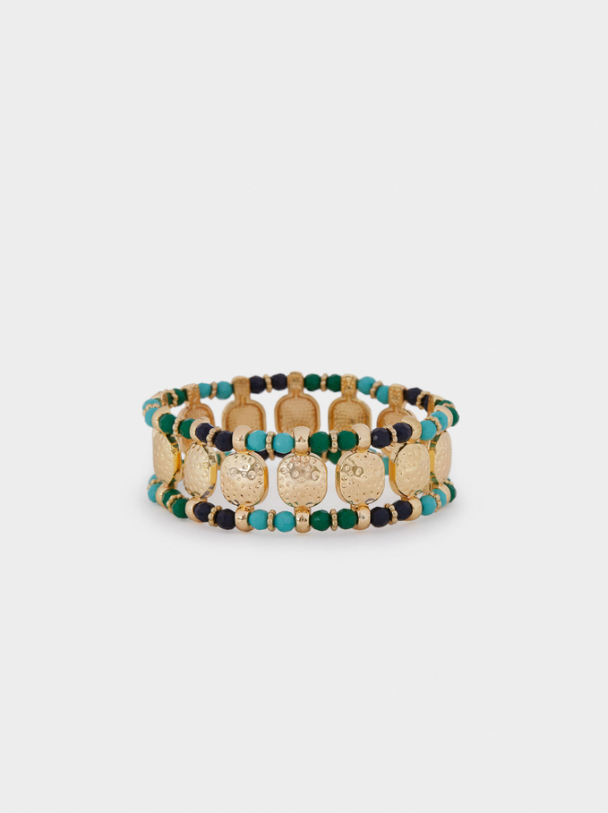 Es una hermosa pulsera ajustable de abalorios, que está diseñada con pepitas de colores verdes, azules y moradas. Además, contiene pequeños aretes en color dorado que la hacen hermosa y espectacular. Convirtiéndola en una de las pulseras más solicitadas por las mujeres jóvenes y atrevidas, que están dispuestas a usar lo que está en tendencia. Inclusive, su composición es de 20% de poliéster, 50% de Zinco y 30% de Vidrio Cristalino. Así que, anímate a adquirirla por la plataforma web de Parfois por un cómodo precio de 7,99 euros.