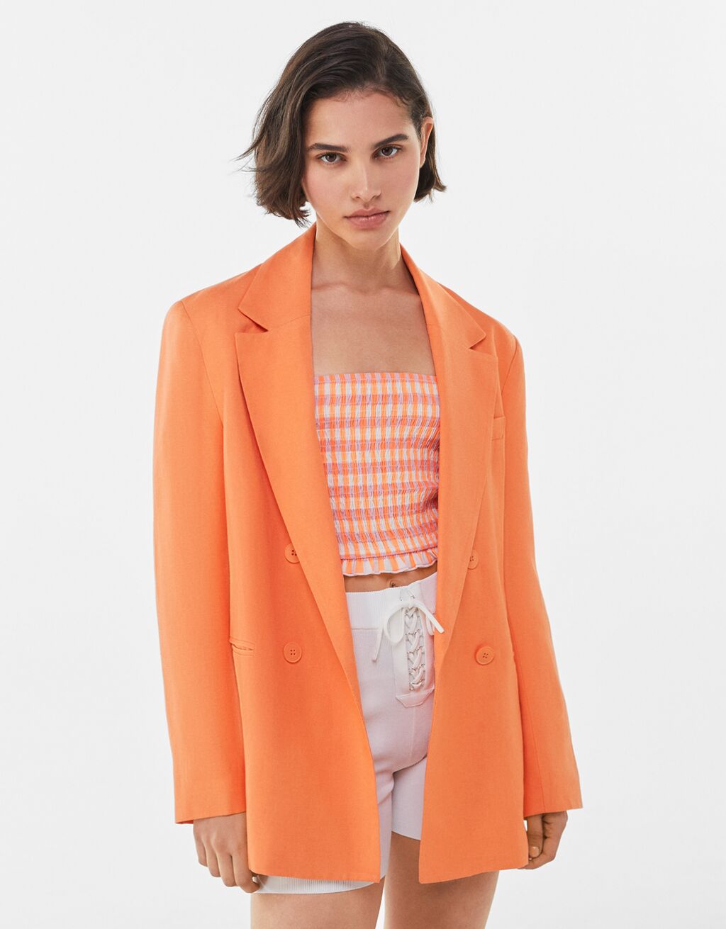 Ahora tenemos un blazer un poco más formal con un diseño elegante y vistoso, que te hará lucir increíble. Es perfecto para ir a trabajar o para una reunión, además que viene en colores vivos que hacen referencia a la primavera. Puedes comprar esta increíble prenda por tan solo 35.99 euros, además que viene en 3 colores naranja, turquesa y arena. Un blazer muy atractivo por parte de la marca Bershka que se encuentra disponible en las tallas: Xs, S, M, L.
