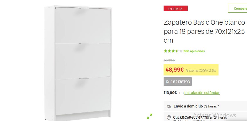 El zapatero Basic One se caracteriza por ser un kit con 3 puertas batientes, que está fabricado en melamina con un color blanco. Además, con un acabado de afecto madera; contiene un tirador de metal de color blanco y dispone de capacidad para almacenar 18 pares de zapatos. Su montaje es completamente sencillo y no requiere mucho tiempo, inclusive tiene toda la ferretería necesaria para realizarlo. Entonces, qué esperas para obtenerlo por Leroy Merlin a un precio de 48,99€.