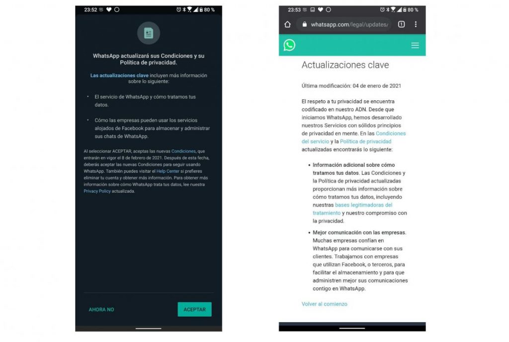 Lo que muchos no esperaban fue que whatsapp lanzará un comunicado, donde establecía que las personas que no aceptaran las nuevas condiciones perderían su cuenta. Esto causó mucho miedo e indignación por parte de los usuarios de la aplicación. Debido a esto Whastapp tuvo que retrasar la fecha de los nuevos términos.