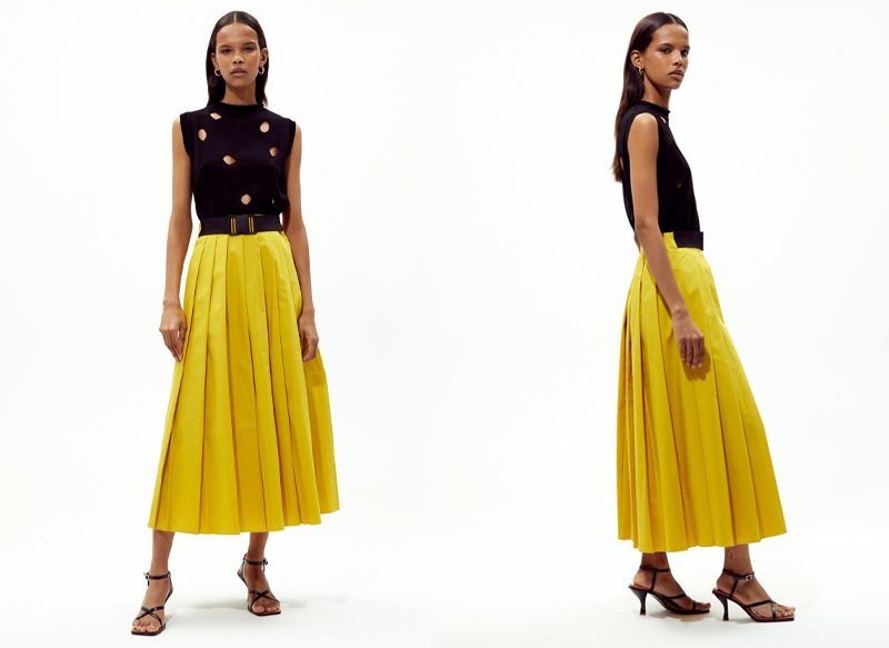 Esta falda tablas cinturón, que se encuentra a la venta por 39,99 euros, se encuentra confeccionada en algodón (65%) y poliéster (35%). Esta falda de tablas con cinturón cuenta con un acabado en un tono amarillo muy interesante.