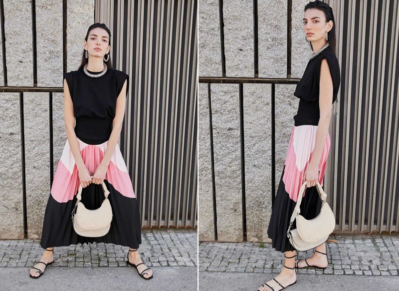 Es una falda midi plisada multicolor que combina el negro con el rosa en dos tonalidades diferentes, una más clara que la otra. Además, el diseño ofrece unas ondulaciones para crear un efecto muy original.