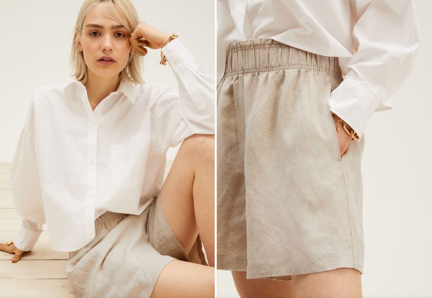 Ahora presentamos un pantalón mucho más cómodo y versátil, que puedes utilizar para salir a caminar o hacer tus actividades diarias. En este caso presentamos un pantalón corto que posee una mezcla entre lino y viscosa. Su diseño es de corte alto con una elástica revestida y ribete de volante en la cintura, además cuenta con bolsillos en los costados. Este pantalón es sumamente versátil y te lo podrás combinar con casi cualquier prenda. En H&M puedes elegir entre tres colores diferentes: blanco, negro y beige. Lo mejor de todo es que esta prenda puede ser tuya por tan solo 14.99 euros.