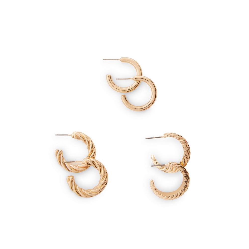 Como puedes ver tienen de todos los estilos. Mezcla tachuelas y piedras y consigue el look perfectamente cuidado y pensado para tus orejas. Tenemos en Primark un pack de 3 pares de pendientes gruesos y dorados de aro de diseño trenzado y tamaño mediano por solo tres euros que te dejarán con la boca abierta.