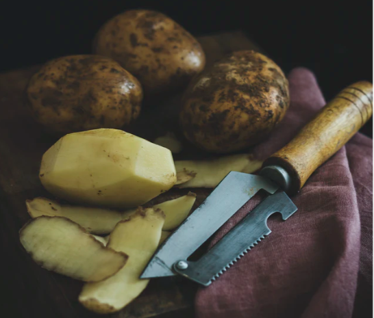 Aquí el secreto está en cortar las patatas de manera uniforme y ni muy finas pero tampoco en trozos muy gordos. Lo mejor es cortar las patatas peladas por la mitad y a lo largo. Y después, con el lado plano de la superficie del corte, corta la patata en trozos de aproximadamente 1/8 de pulgada de grosor. Y se recomienda no usar un procesador de alimentos, porque la mayoría de ellos las demasiado delgadas.