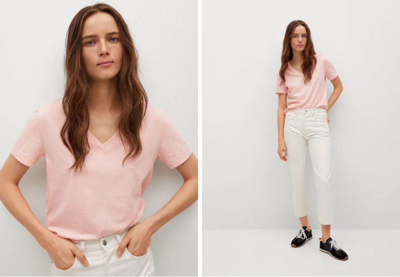 Ahora presentamos una camiseta manga corta de 100% de algodón, que cuenta con un diseño corto recto y cuello pico. Esta camiseta unicolor viene en cuatro colores: blanco, negro, verde y rosa. Es un prenda muy cómoda y que puedes utilizar para muchas cosas, ya que la podrás utilizar ya sea en tu casa o colocarla debajo de un blazer o chaqueta. Esta prenda tiene un precio de 7.99 euros en cualquier tienda física o en la tienda virtual de Mango.