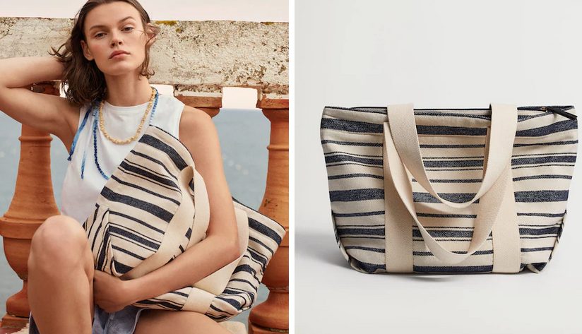Y a la playa nos podemos ir con este bolso shopper tejido algodón en Mango por 25,99 euros y en color azul marino. Es 100% Algodón con un diseño de rayas y que lleva doble asa corta y un compartimento interior muy útil para llevar tus cosas. Además de un cierre de cremallera superior y forro interior.