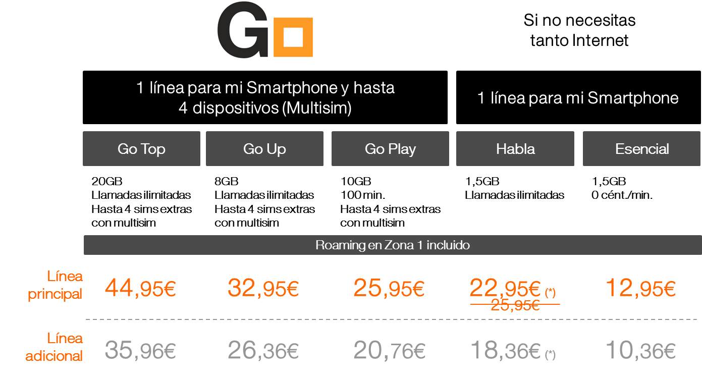 Terminamos con otra de las compañías de las que ofrecen datos ilimitados en el móvil, Orange. Su oferta de gigas ilimitados para prepago y contrato es de las que cuenta con un precio promocional más agresivo en el mercado. La tarifa Go Up de Orange, con gigas ilimitados, tiene un coste de 35,95 euros al mes. Es más caro que Digi, pero es cierto que todas las pretaciones que te ofrece Orange son mayores, sobre todo por el famoso 5G.