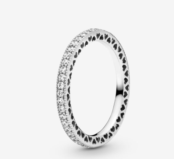 Nos despedimos de estas joyas de Pandora más vendidas, y que son aptas para todos los bolsillos, con este anillo en plata de ley, 46 circonitas cúbicas transparentes y detalles de corazones.
