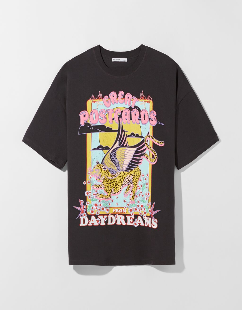 La ropa oversize ha llegado para quedarse y hacernos la vida mucho más cómoda. El confinamiento y el teletrabajo ha cambiado los conceptos de la moda actual y la ropa que aporta confort se ha convertido en nuestra favorita. Pero comodidad y estilo no están reñidos, como demuestra esta camiseta de Bershka, en color gris y con un print en la parte delantera, de inspiración rockera. Esta fabricada en 100% algodón, y pertenece a la colección ‘Care for fiber’ por lo que al menos un 50% es algodón orgánico. El precio de esta camiseta es de de 12,99€.