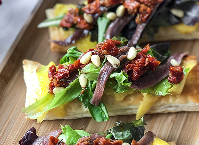 En primer lugar tienes que cortar el hojaldre en la porción deseada y cocinar a 200ºC durante 10 minutos. Tras sacarlo del horno tendrás que colocar encima unas tiras de mango pelado, unos brotes de lechuga, anchoas, tomate seco y finalmente unos piñones.