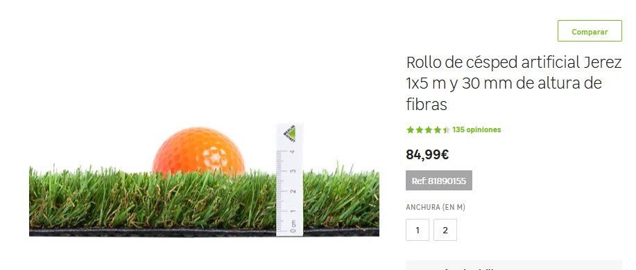 Este rollo de césped artificial es de 30 mm de altura, enrollado en un rollo de 1×5 metros para cubrir una superficie de 5 m². Además, con una resistencia que es moderada al tránsito y que está fabricada con fibras de polietileno, polipropileno de 4 colores en tonos verdes. Incluyendo el color marrón claro, dándole un aspecto estético y realista. Inclusive, tienen un acabado en polietileno, material ligero y moldeable, facilitando la instalación y el agarre de las fibras, para que no se suelten. Siendo perfecto para que lo instalemos en nuestros jardines, por lo que debería adquirirlo por Leroy Merlín a un precio de 84,99€.