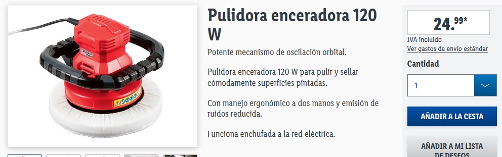 Es otro de los productos solicitados por la plataforma de Lidl, ya que esta pulidora enceradora permite sacar brillo a la carrocería de nuestro coche. Se caracteriza por ser un potente mecanismo de oscilación orbital, siendo perfecto para pulir y sellar cómodamente superficies pintadas. Además, es perfecto por su manejo ergonómico a dos manos y por la emisión de ruidos reducidas. Funciona enchufado a la red eléctrica, con una potencia de conexión de 120W, velocidad de giro en vacío de 3700 rpm. Entonces, anímate para adquirirlo por la plataforma de Lidl por un precio super accesible de 24,99 euros.