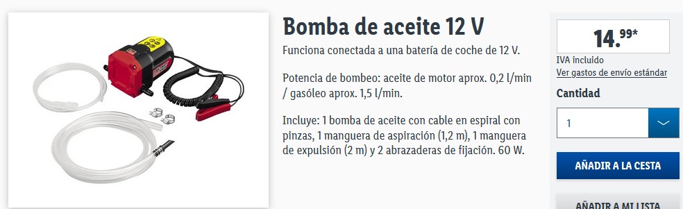 Es una bomba que funciona conectada a una batería de coche de 12V, además cuenta con una potencia de bombeo perfecta. Como es el caso con el aceite de motor y gasóleo, esta viene incluida con una bomba de aceite con cable espiral con pinzas. Además, con una manguera de aspiración, manguera de expulsión y dos abrazaderas de fijación. Entonces, qué esperas para adquirirla por Lidl por un precio accesible de 14,99 euros.