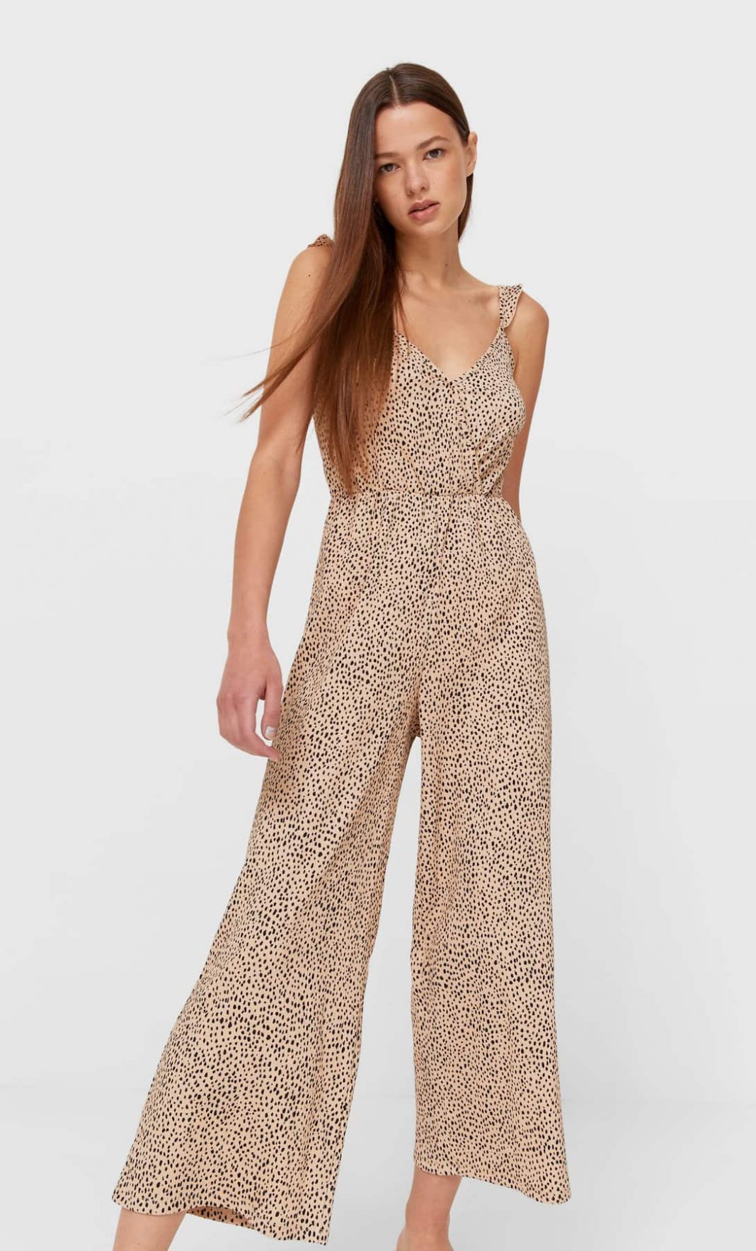 Presentamos una prenda elegante perfecta para que puedas lucir genial esta primavera. En este caso tenemos un mono fluido de tirantes con detalle de volantes y escote pico, que se encuentra disponible en varios colores en cualquier tienda física de Stradivarius. Este mono resulta ser muy cómodo, y lo podrás utilizar en muchas ocasiones. Esta prenda puede ser tuya por el módico precio de 19.99 euros.