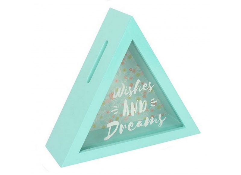Es una original hucha de forma triangular que tiene la parte frontal transparente con el texto «Wishes and Dreams«, es decir «Deseos y sueños». Su color es azul turquesa y tiene unas dimensiones de 21 x 18 x 7 cm.