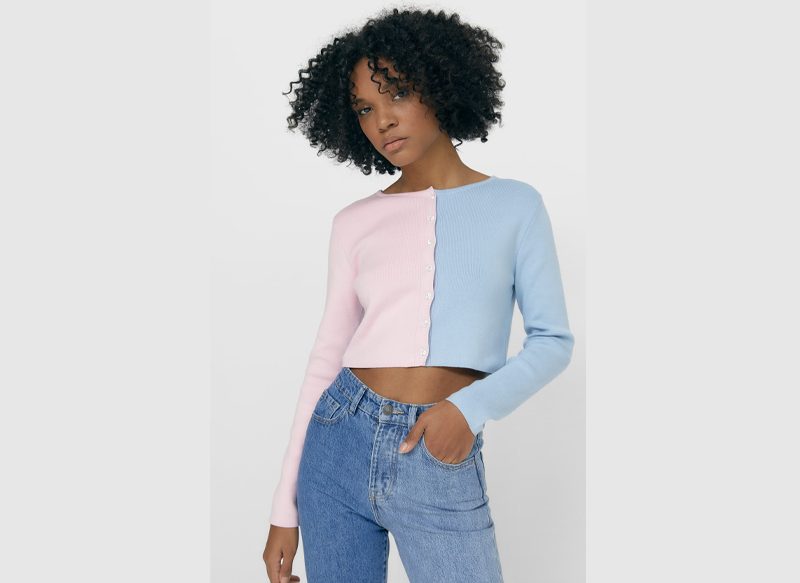 Para finalizar nuestras recomendaciones de las rebajas de Stradivarius tenemos que mencionar este cárdigan crop color block. Este es un diseño muy original con doble tonalidad, pudiendo elegir entre azul celeste/rosa o en dos tonos de malva.