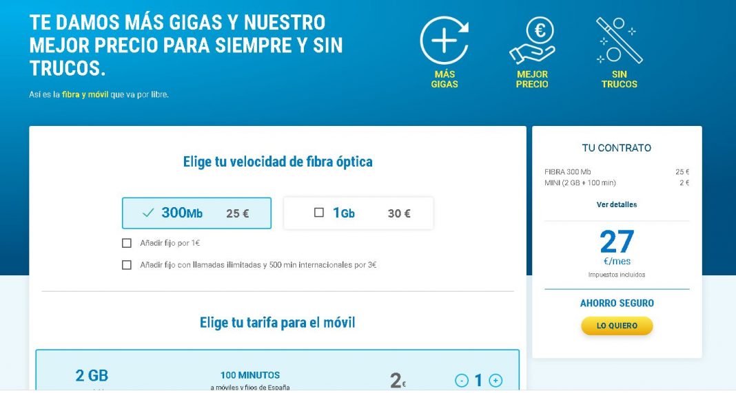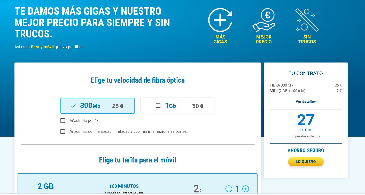 Por ejemplo, la Fibra 300 Mbps + Combo 2GB para navegar por 27 euros, la Fibra 300 Mbps + ilimitado 8GB para navegar por 30 euros, la Fibra 300 Mbps + datos ilimitados para navegar por 45 euros. También tienen la de Fibra 1 Gbps + Combo 2GB para navegar por 32 euros, la de Fibra 1 Gbps + ilimitado 8GB para navegar por 35 euros, o por ejemplo, Fibra 1 Gbps + ilimitado 12GB para navegar por 36 euros.
