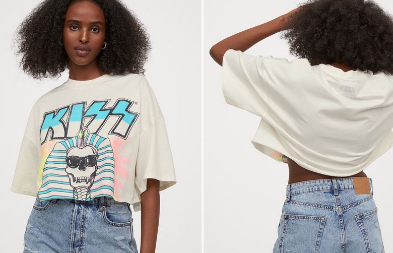 Vamos a meterle más caña a estas camisetas de H&M. En este caso con esta camiseta cropped de punto con motivo estampado delante. Y el motivo es una imagen del grupo de heavy Kiss que si eres una mujer cañera te viene muy bien. Aunque hay diferentes estampados. Todo ello por solo 9,99 euros.