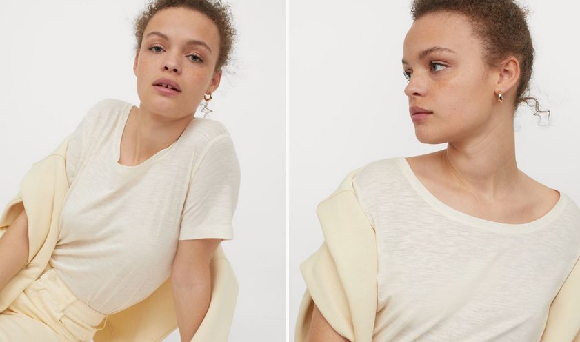 ¿Quién ha dicho que las camisetas son algo simple? Para nada. El ejemplo lo tenemos con este modelo de H&M. Una camiseta en punto flameado suave de mezcla de algodón y modal con escote amplio y bajo redondeado.