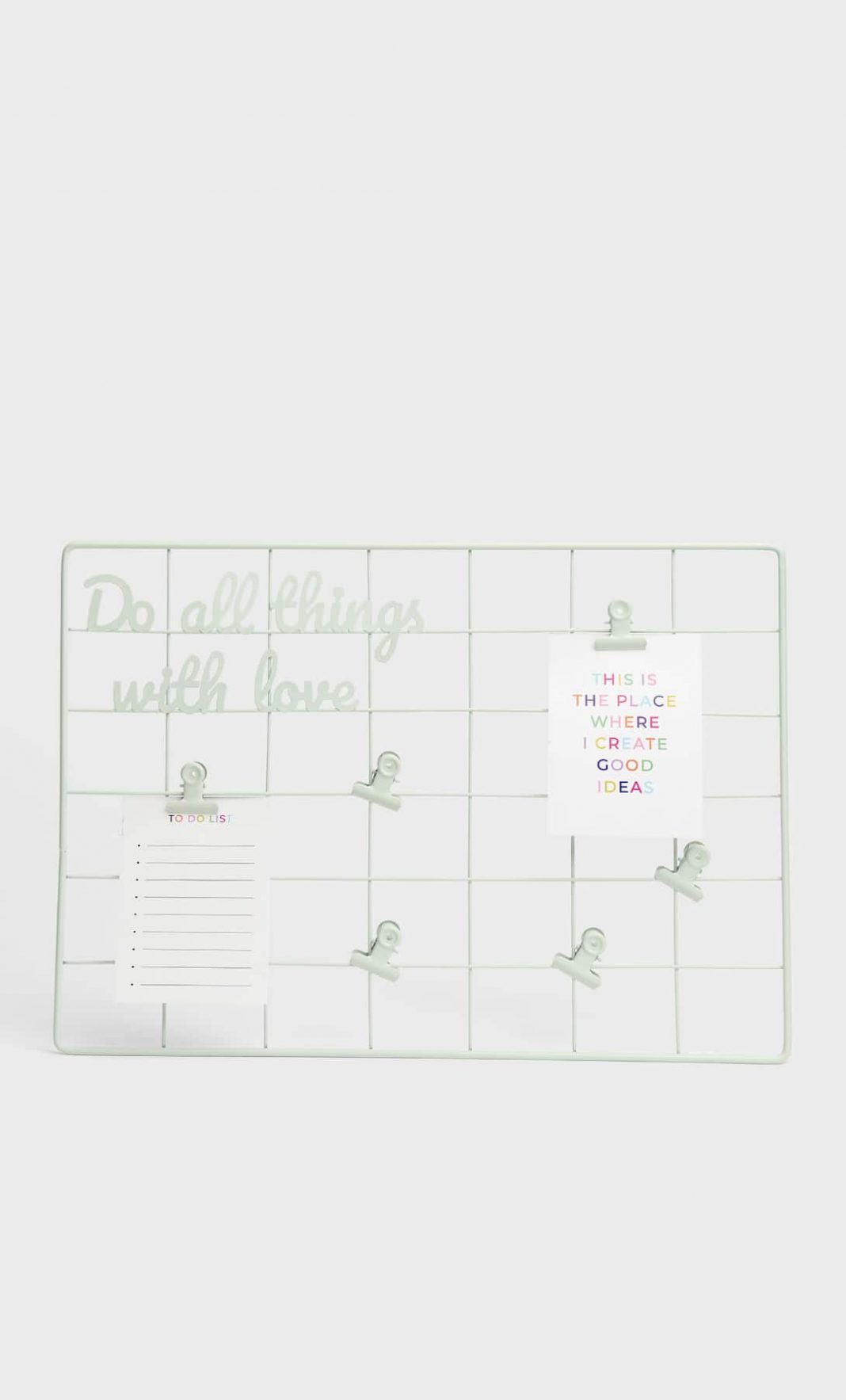 Este tipo de productos tienen mucho éxito en el Ikea, pero es cierto que en lugares como Stradivarius también los puedes encontrar. Se trata de un cuadro organizador donde puedes dejar tus mensajes y buenos recuerdos siempre a la vista en este cuadrito metálico con mensaje incluido. Viene en color agua marina y amarillo.