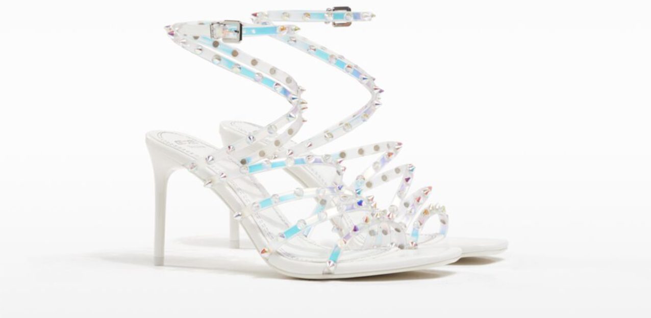 Para los eventos más arreglados de verano crea una sandalias de 10 cm de tacón que combinan a la perfección con sus diseños. Son de tiras transparentes y tachuelas plateadas. El tacón es fino y en color blanco. Además al ser ajustables al tobillo se sujetan bien y puedes andar con comodidad. Cuestan 45,99 € posicionándose entre lo más top de la colección de Bad Gyal x Bershka, pero son una apuesta segura.